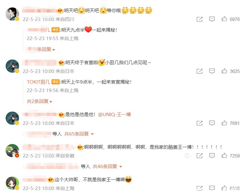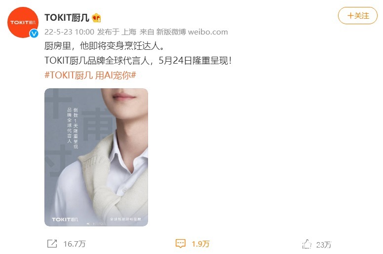 5月23日,厨几也在官方微博中发文表示厨房里,他即将变身烹饪达人。TOKIT厨几品牌全球代言人,5月24日隆重呈现!并配上了一个半张脸的海报,旁边写着品牌全球代言人,倒数一天隆重呈现。