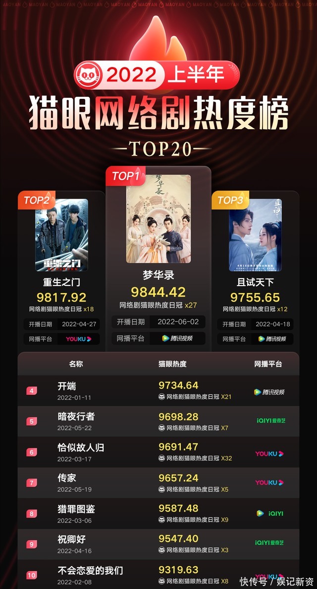 以上就是2022年上半年猫眼网络剧热度榜单前五的作品不知道有没有你喜欢的呢2022年已经过半那小娱就祝福大家在下半年能够顺顺利利、开开心心